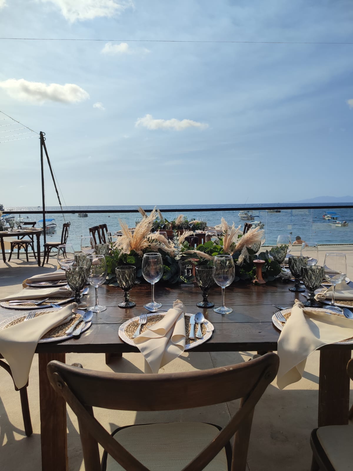 ? A elección de la pareja; mesa redonda con mantel blanco o mesa rectangular de madera, silla tiffany blanca o dorada, plato base dorado o plateado, copa transparente para vino, copa de agua, servilleta de color del catálogo de casa
