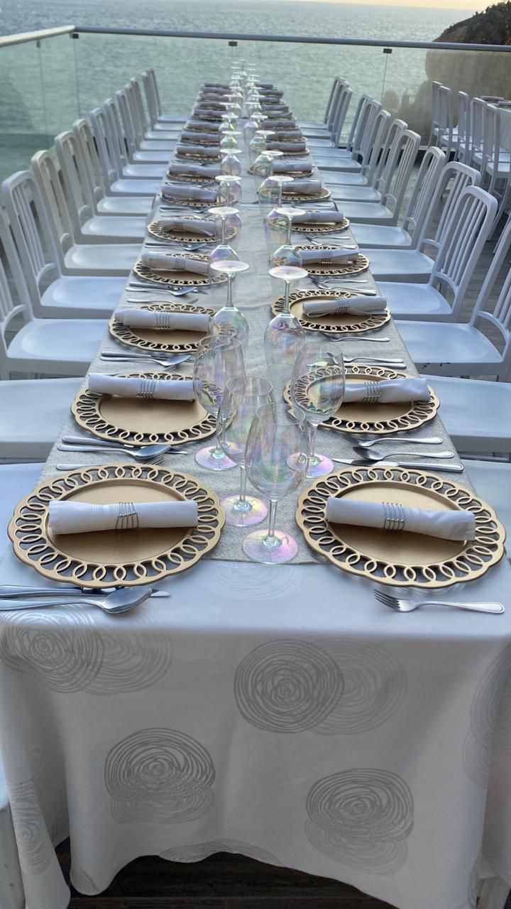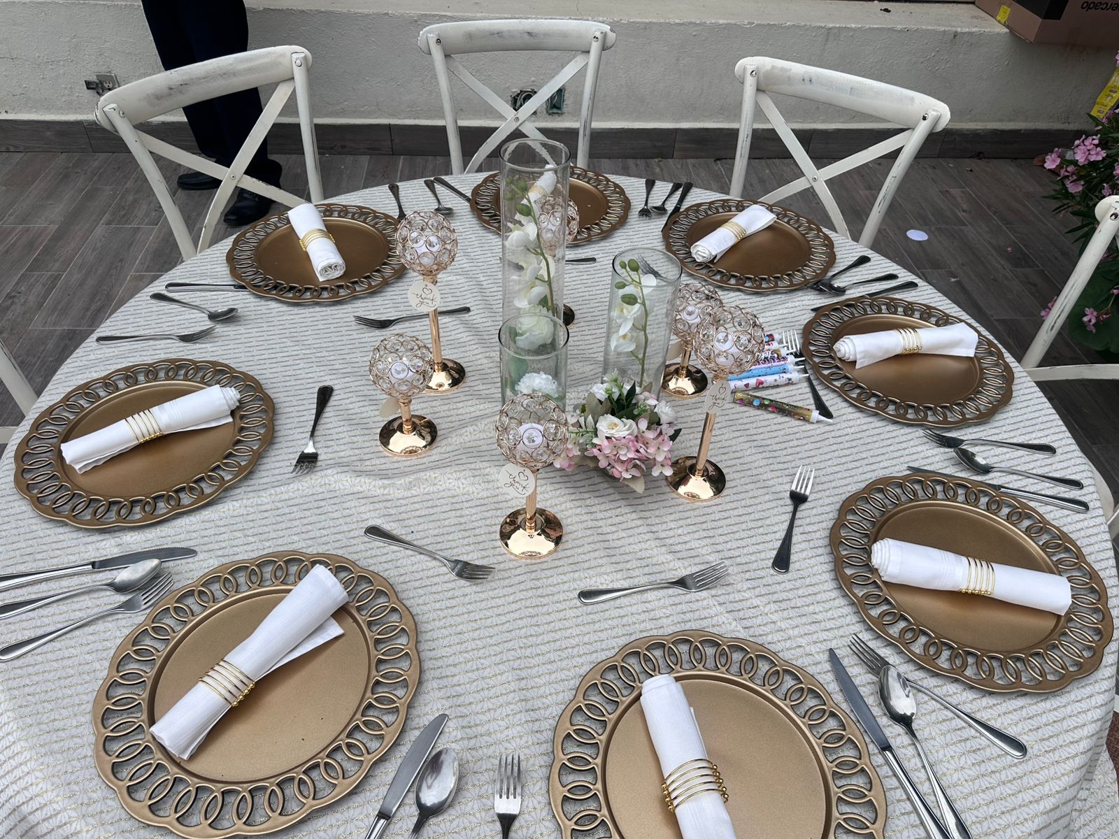 • Montaje con mesas redondas y mantelería (colores existentes a elección).