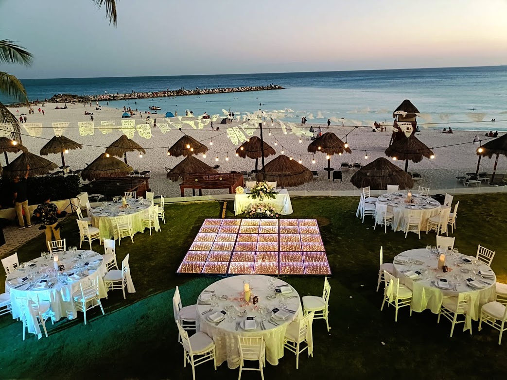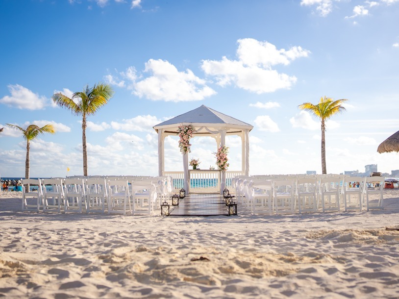 • Montaje de ceremonia: gazebo decorado con telas y sillas blancas (mobiliario disponible del hotel).