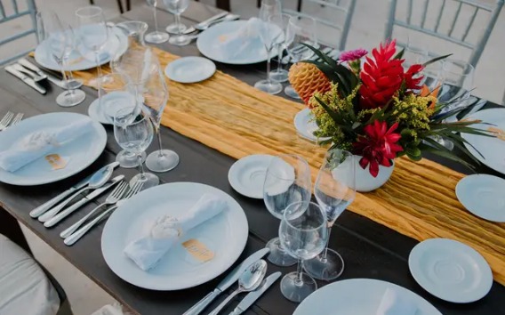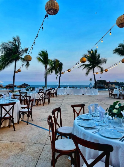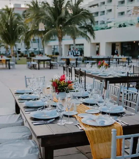 • Montaje del banquete con mesas redondas o cuadradas con mantelería blanca, sillas Tiffany, loza y cristalería de lujo.